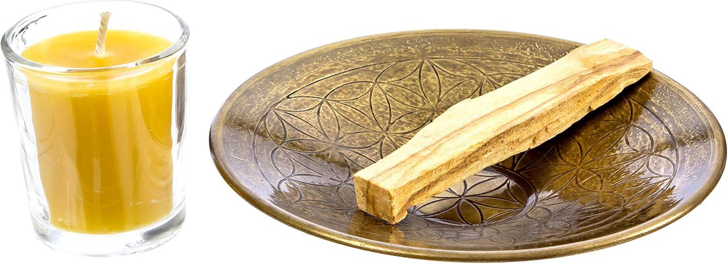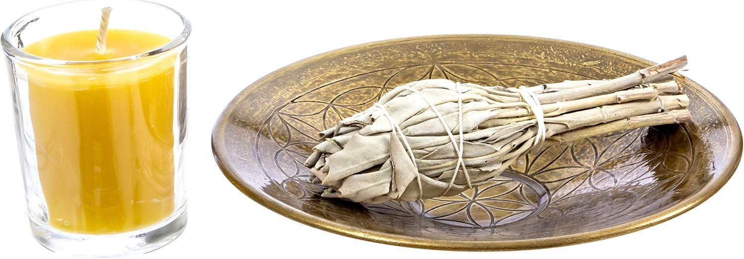 Our incense kit features a Flower of Life brass smudge bowl, a White Sage Smudge Stick Torch, a Palo Santo Incense Stick, and a hand-poured, 100% pure, natural beeswax votive candle in a glass candle holder. This kit is compact and can travel!