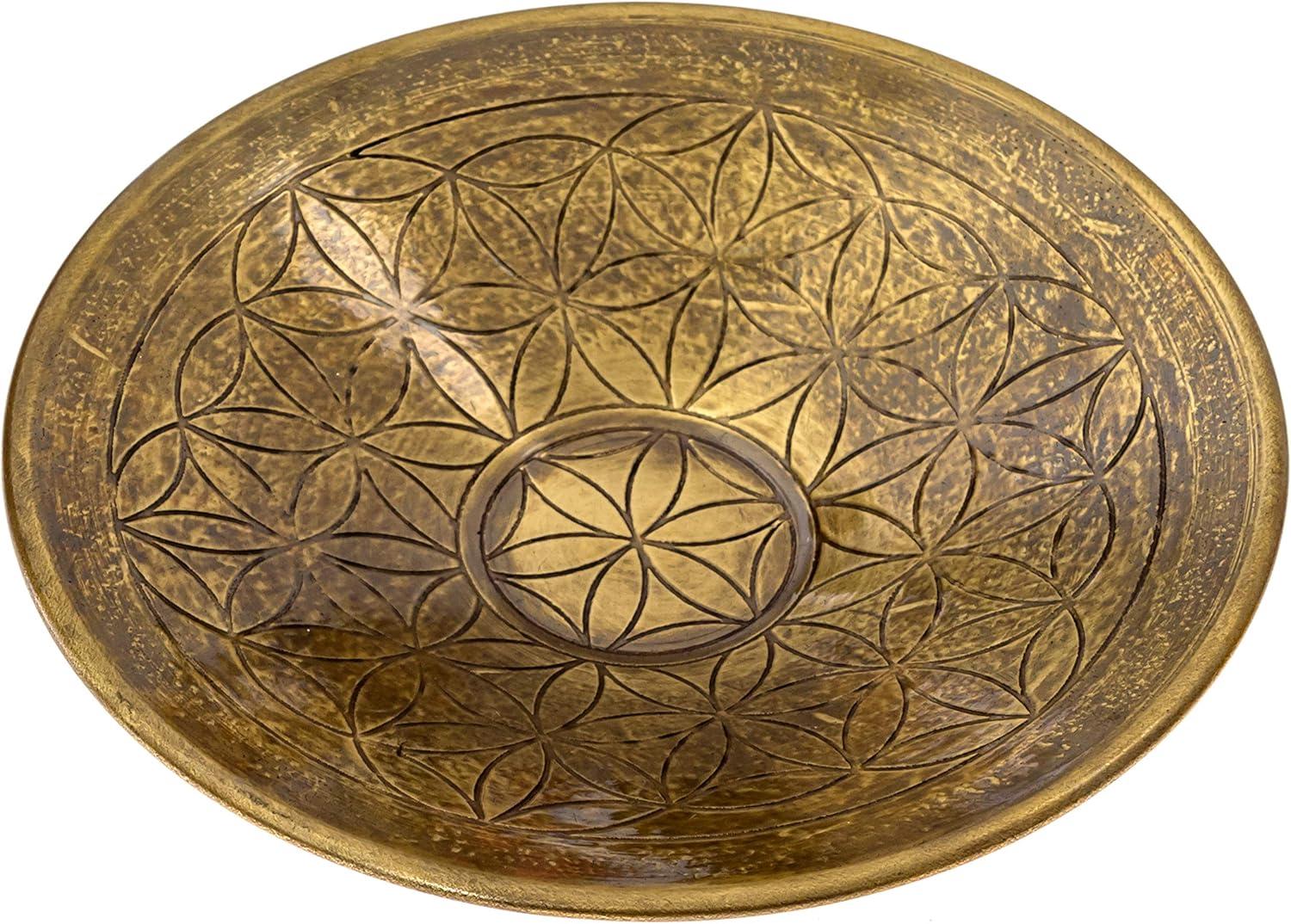 The stunning brass dish features a sacred geometric pattern, the Flower of Life. It represents the cycle of creation and the connection of all things. It is approximately 6″ wide and sits slightly raised above the table. It is fireproof, perfect for holding your burning dried herbs incense sticks or even incense cones!